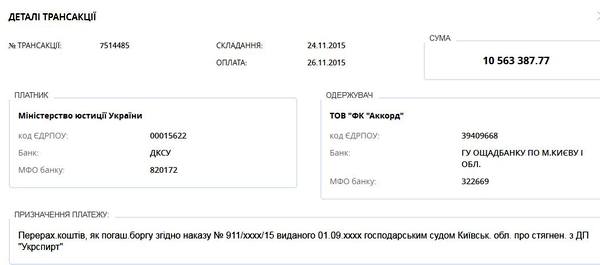 По данным Официального портала публичных финансов Украины «Е-data», как минимум половину этих денег «Юридическая консалтинговая группа» получила уже 26 ноября. Это Государственная исполнительная служба Министерства юстиции выполнила решение суда, взыскав с «Укрспирта» десятки миллионов в пользу частных “прокладок” – 24,93 млн. грн. пошло “Правовой консалтингоовий группе” и 10,56 млн. грн. – “Аккорду”. Хотя эти деньги должны были оказаться в Национальном банке Украины.