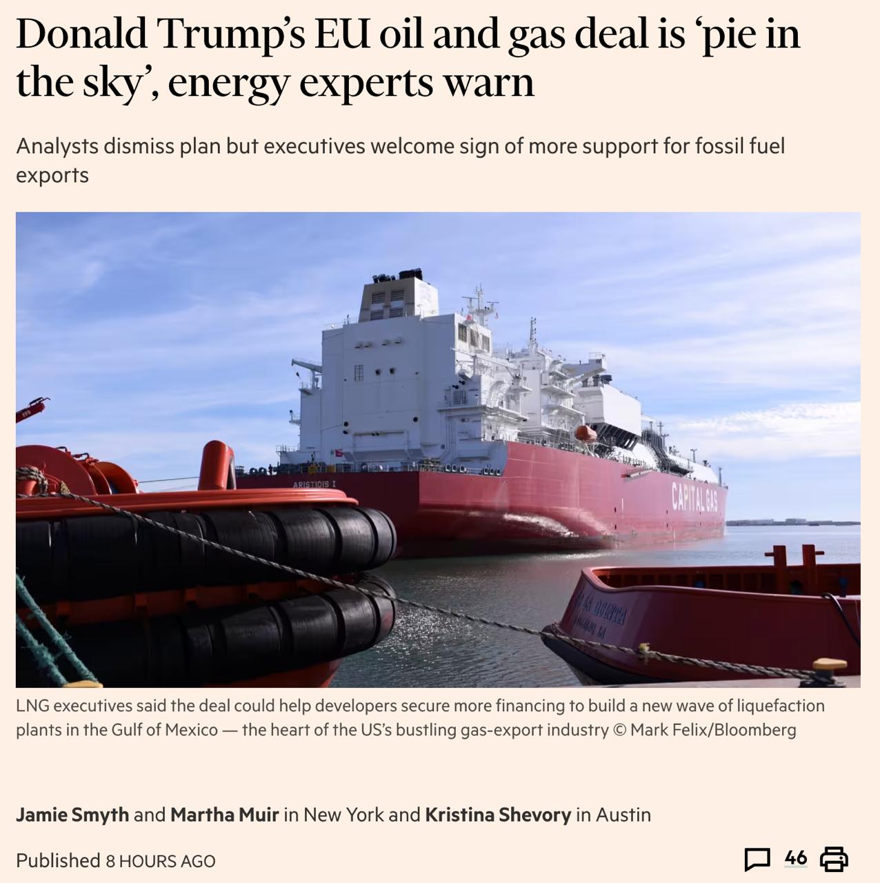«Для этого Европе пришлось бы значительно увеличить импорт газа и нефти из США, отвернувшись от других поставщиков, при этом рассчитывая на то, что цены на нефть и газ останутся высокими или даже возрастут, чтобы достичь заявленной цели в 250 миллиардов, — сказала Анн-Софи Корбо, аналитик Центра глобальной энергетической политики при Колумбийском университете. - Мы хотим снизить затраты на энергию, а президент Трамп хочет снизить цены на нефть — так что это соглашение просто лишено смысла».