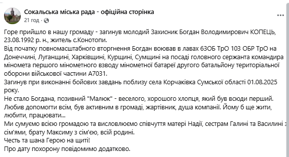 "Во время выполнения боевого задания, 01.08.2025 года, погиб наш товарищ, воин Копец Богдан Владимирович, который с первых дней войны и до последнего вздоха стоял на защите родной земли. Он был не просто воином, а настоящим образцом чести и мужества. Богдан всегда выделялся силой духа и несгибаемой верой в Победу. Он отдал самое ценное — свою жизнь — за будущее Украины, за то, чтобы мы могли жить и защищать нашу землю дальше. Склоняем головы перед светлой памятью павшего воина. Его героизм никогда не будет забыт. Вечная слава и память Герою! Соболезнуем родным и близким", — отметили в 63 отдельном батальоне.