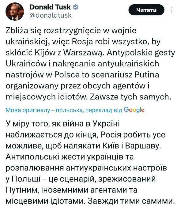 «Финал войны в Украине близок, поэтому Россия предпринимает шаги для того, чтобы разобщить Киев и Варшаву. Антипольские проявления со стороны украинцев и усиление антиукраинских настроений в Польше — это план Путина, воплощённый иностранными агентами и местными дураками. Та же история, как всегда», - написал Туск в Х.