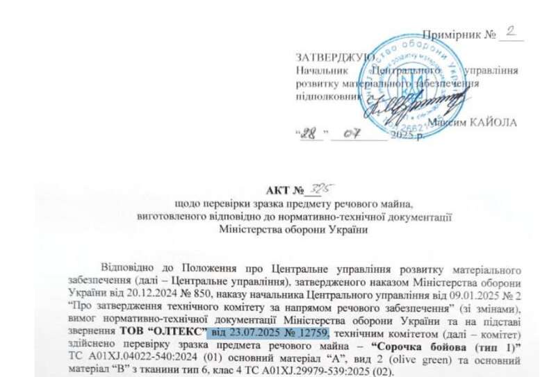 Примечательно, что за день до этого, 23 июля ООО «Олтекс» обратилось в управление развития материального обеспечения с просьбой проверить на соответствие рубашку боевую (тип 1) основной материал «А», вид 2 (olive green) и основной материал «B» из ткани тип 6, класс 4 ТC A01XJ.29979-539:2025 (02). Именно на рубашки такого типа, класса, и вида ДОТ объявил тендер лишь на следующий день.