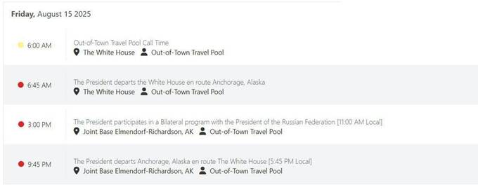 Белый дом обнародовал расписание Трампа на день переговоров с Путиным в Аляске.