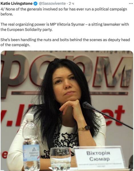 Фактическим организатором политической кампании Залужного стала народная депутат от партии Петра Порошенко "Европейская солидарность" Виктория Сюмар. Она отвечает за все детали в роли заместителя руководителя кампании, добавляет журналистка.