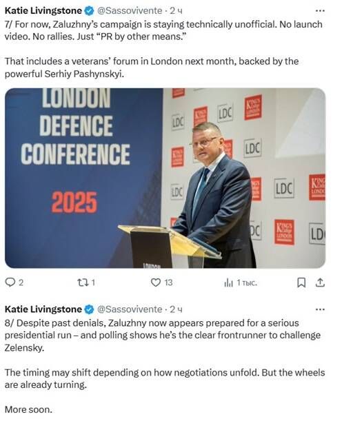 По данным Ливингстон, медийную поддержку кампании доверили бывшей журналистке украинской редакции Би-Би-Си, Оксане Тороп, которая ранее активно освещала работу Залужного в должности главкома ВСУ.