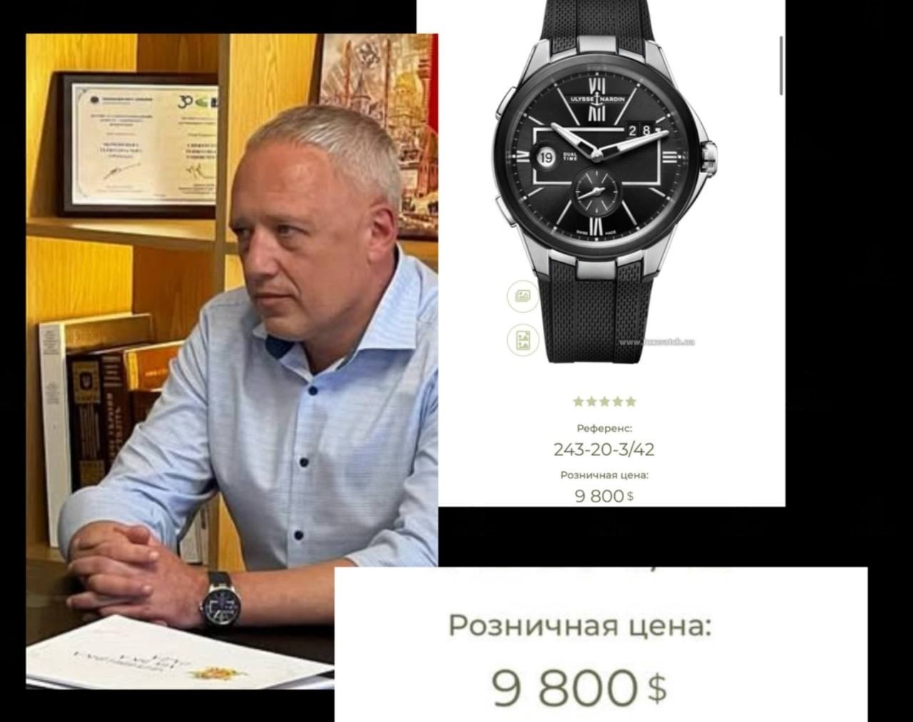 Роман Кличук, городской голова Черновцов, появился на публике с часами Ulysse Nardin Dual Time 243-20-3/42, стоимость которых составляет 9 800 долларов США или примерно 404 000 гривен.