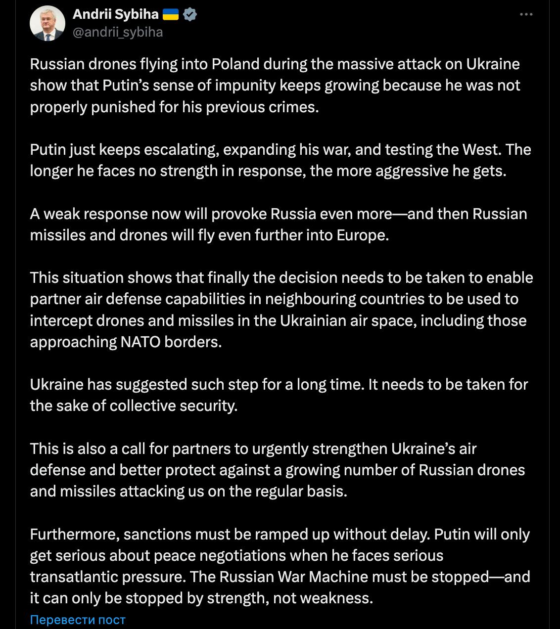 «Нерешительные действия приведут к тому, что Россия станет еще более агрессивной, и российские ракеты с беспилотниками смогут проникать глубже в Европу. Этот инцидент демонстрирует необходимость наконец принять решение о возможности применения средств ПВО партнеров в соседних странах для перехвата беспилотников и ракет в воздушном пространстве Украины, в том числе приближающихся к границам НАТО», - отметил министр иностранных дел Сибига.