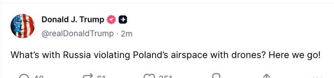 "Что происходит с нарушением воздушного пространства Польши российскими дронами? Прибыло время!", — отметил президент США.