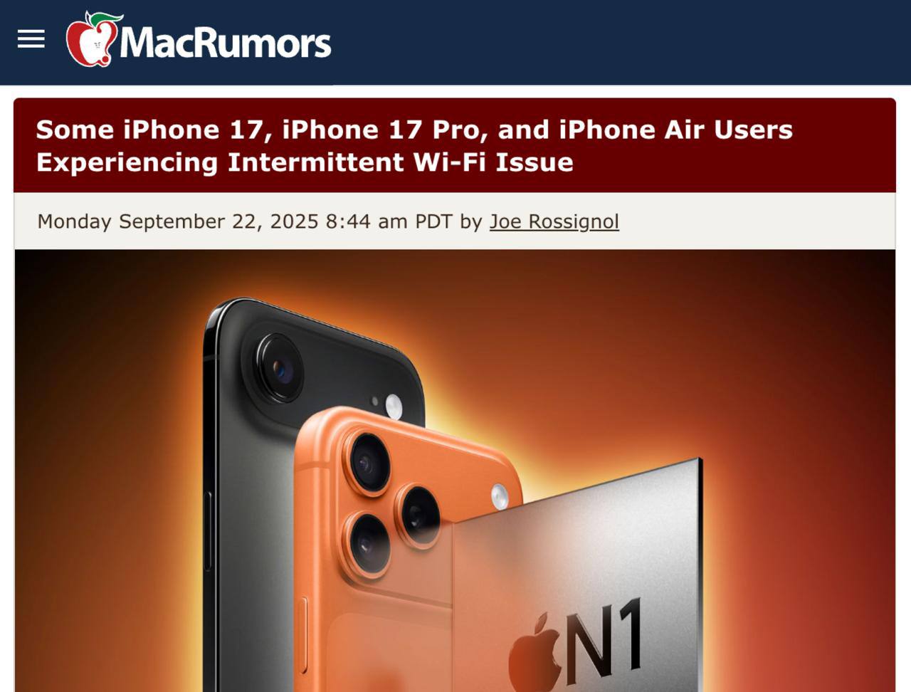 Первые обладатели iPhone 17, 17 Pro, Pro Max и Air сообщают о постоянных трудностях с Wi-Fi — соединение прерывается и не функционирует стабильно.