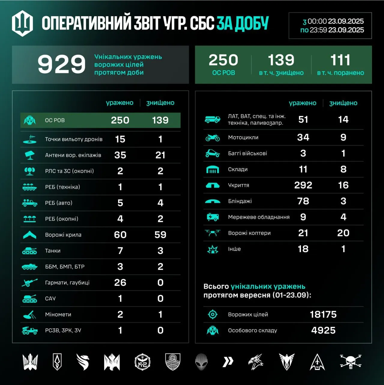 Пресс-служба Сил беспилотных систем сообщила, что в прошедшие сутки (23 сентября) они поразили/уничтожили 929 целей противника, среди которых: