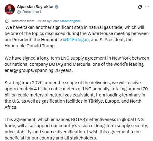 Соответствующее соглашение между турецкой энергетической компанией BOTAŞ и одной из крупнейших независимых интегрированных энергетических и товарных групп Mercuria подписали генеральный директор BOTAŞ Абдулвахит Фидан и президент Mercuria Даниэль Йегги в Турецком доме в Нью-Йорке. Об этом в своем X сообщил министр энергетики и природных ресурсов Турции Алпарслан Байрактар.