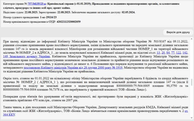 Соответствующее следствие осуществляется в рамках уголовного производства №42022112320002059, которое было открыто Главным следственным управлением Нацполиции Украины 25 августа 2022 года. Фигурантам данного дела предварительно инкриминируется совершение преступления, предусмотренного ч. 2 ст. 364 Уголовного кодекса (УК) Украина – злоупотребление властью или служебным положением, что повлекло тяжкие последствия. 14 августа 2023-го Печерский районный суд Киева по ходатайству Офиса Генпрокурора (осуществляет процессуальное руководство по данному делу) наложил арест на эту землю – участки площадью 90,37 га и 56,73 га. Это было сделано для того, чтобы их владелец – ООО “Бионик Ленд” – не мог ими распоряжаться, пока расследуется данное производство, ведь эта земля была признана вещественным доказательством.
