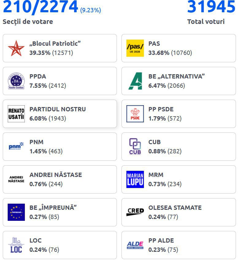На парламентских выборах в Молдове в настоящее время лидирует пророссийский «Патриотический блок». Проевропейская «Действие и Солидарность» (PAS) занимает второе место.