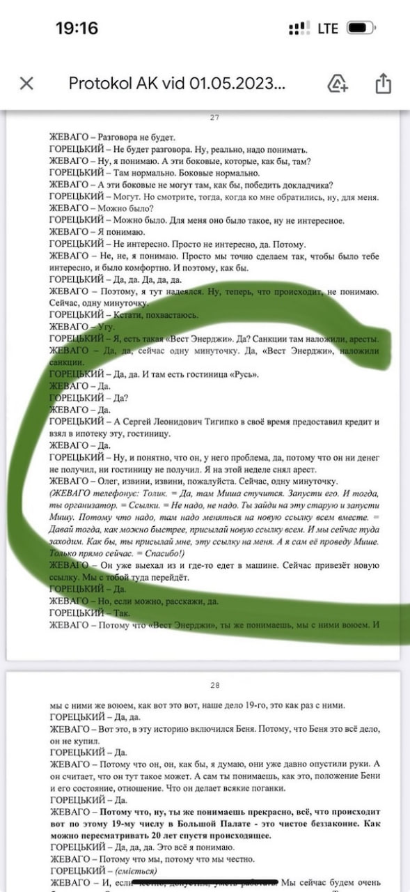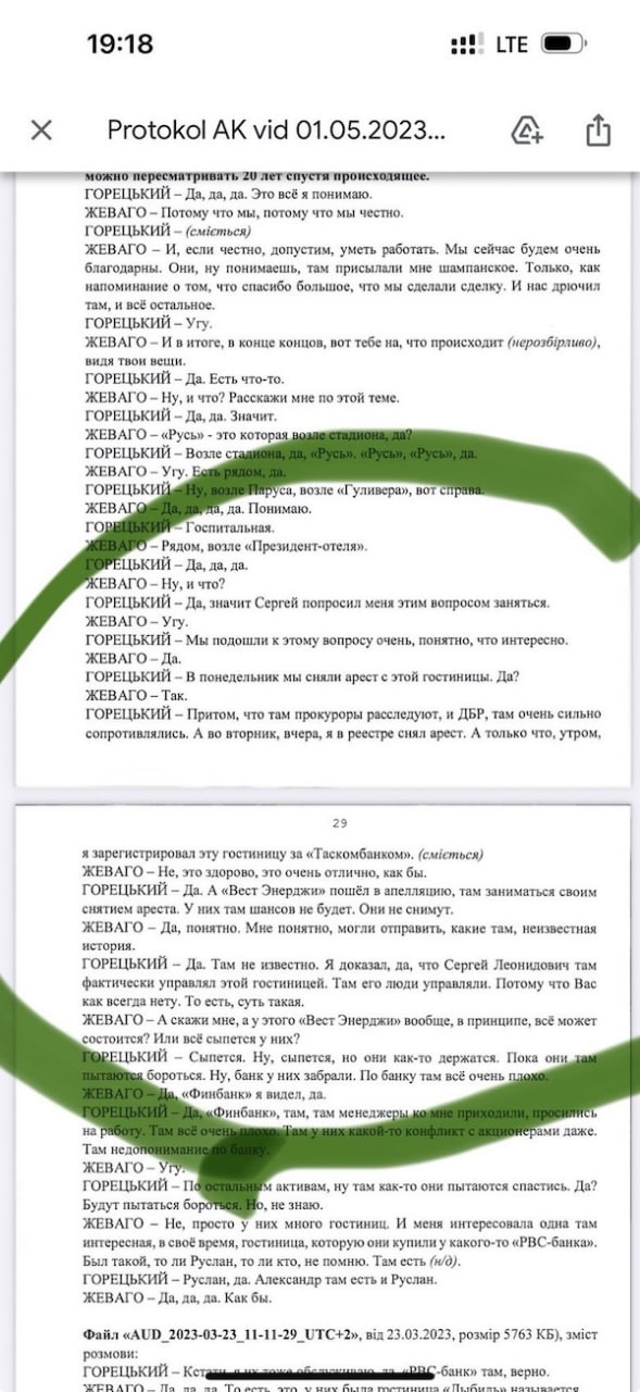 Но это еще не все об образцовой бизнес-модели Тигипко. 2 года назад ко мне попало немного материалов по делу Князева. И там есть эпизод, где сообщник Князева Горецкий говорит с Жеваго. И знаете, что они среди прочего обсуждают? Как для Тигипко сняли арест с отеля "Русь". Горецкий прямо хвалится, что сделал это в обход сопротивления ГБР и прокуроров.