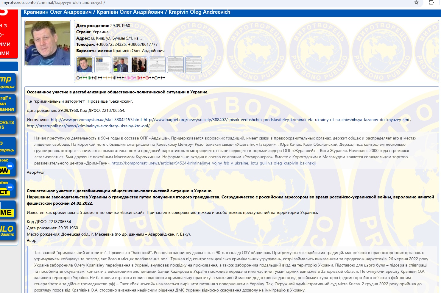 Из его содержания следует: суд "по вновь открывшимся обстоятельствам" принял сторону "Олега Бакинского" в споре, который длился более трех лет и исходил из датированного 11 июля 2022 года соответствующего представления Управления стратегических расследований Нацполиции города Киева №3253/55/125/01-2022. В его тексте было указано, что Крапивин "является одним из лидеров азербайджанской криминальной среды на территории Украины, который организует, координирует, материально обеспечивает функционирование преступных групп, совершающих тяжкие и особо тяжкие преступления на территории Украины". Якобы, Олег Андреевич планирует "прибыть в город Киев, где путем подстрекательства криминальных элементов, прежде всего выходцев из Российской Федерации и близких им лиц, планирует создать массовые протесты с целью оправдания проведения военной агрессии со стороны РФ против Украины".
