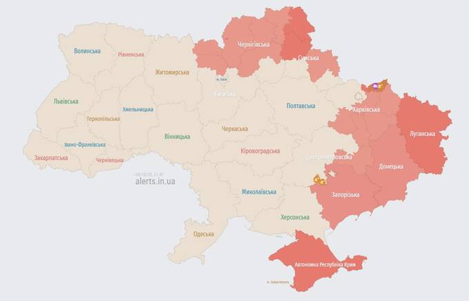 На данный момент объявлена воздушная тревога в нескольких районах Черниговской, Сумской, Харьковской, Днепропетровской областей, а также по всей территории Донецкой и Запорожской областей.
