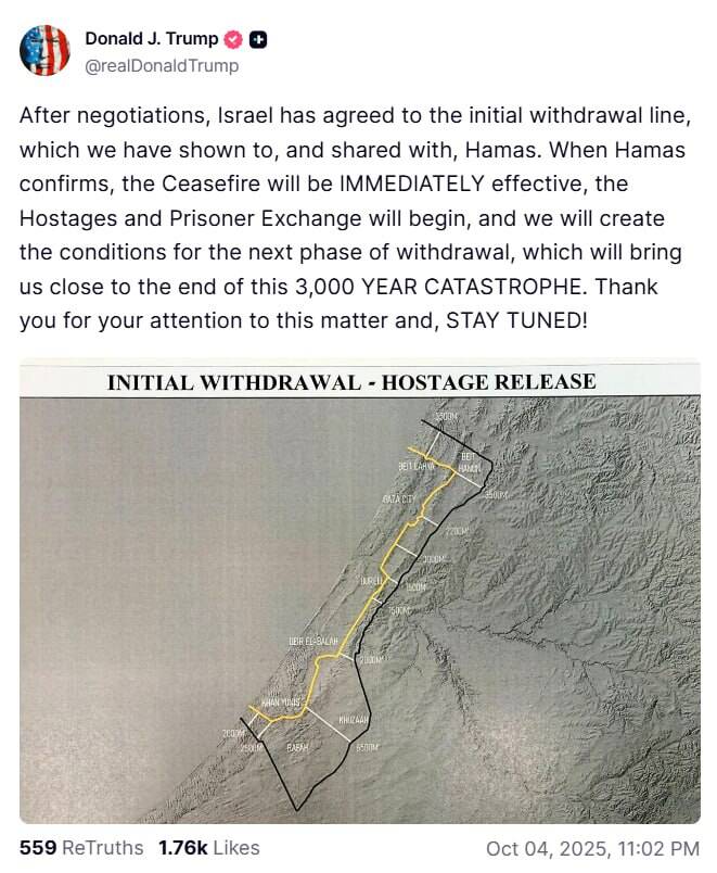 После переговоров Израиль согласился на первоначальную линию отвода, которую мы показали и передали ХАМАС, — Трамп.