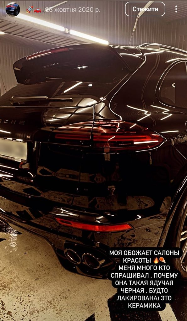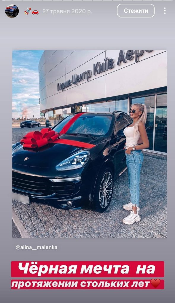С социальных сетей видно, что она приобрела Porsche Cayenne в 2020 году из автомобильного салона. В своем Instagram Алина называла автомобиль «черной мечтой».