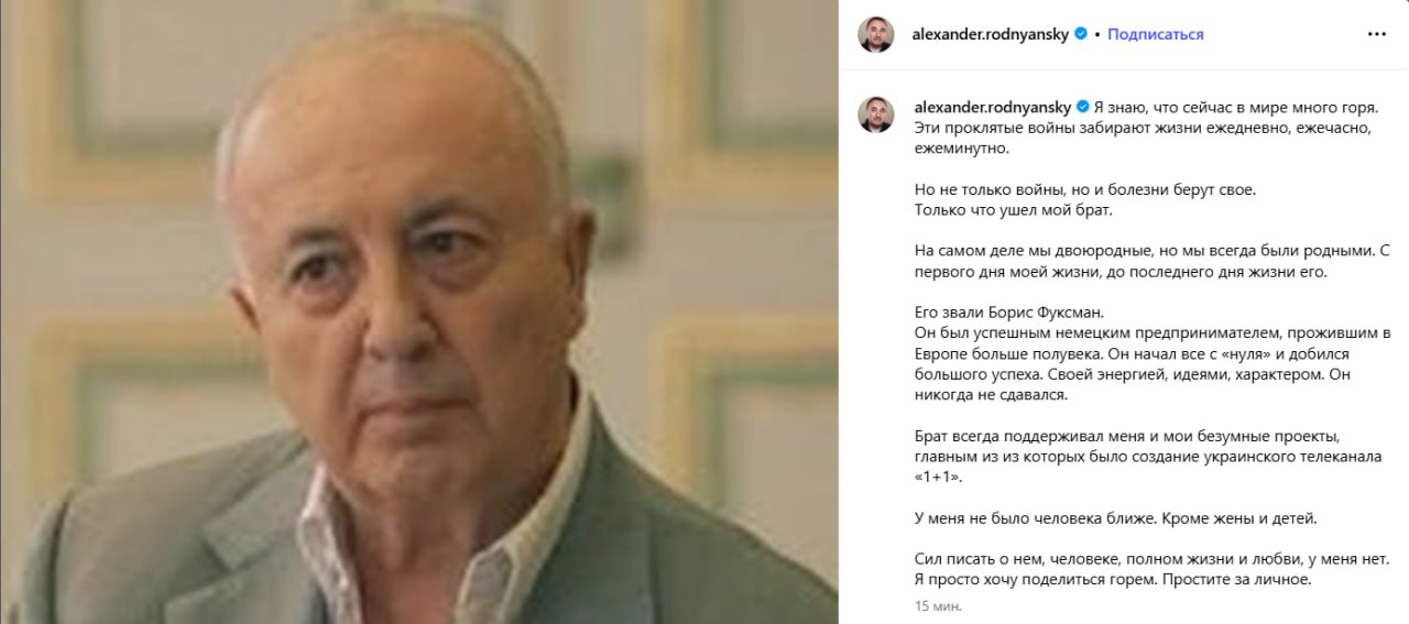 "Только что покинул этот мир мой брат. На самом деле мы двоюродные, но всегда были близки. С первого дня моей жизни до последнего его дня. Его звали Борис Фуксман.