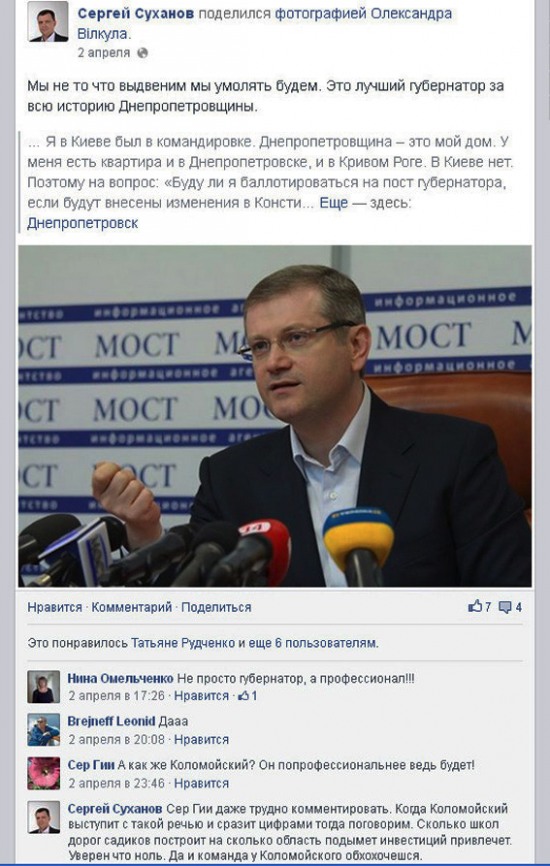 На комментарий, что Коломойский (нынешний глава Днепропетровской облгосадминистрации Игорь Коломойский – ред.) профессиональнее Вилкула, Сергей Суханов парирует (орфография сохранена): «Даже трудно комментировать. Когда Коломойский выступит с такой речью и сразит цифрами тогда поговорим. Сколько школ дорог садиков построит на сколько область подымет инвестиций привлечет. Уверен что ноль. Да и команда у Коломойского обхохочешся».