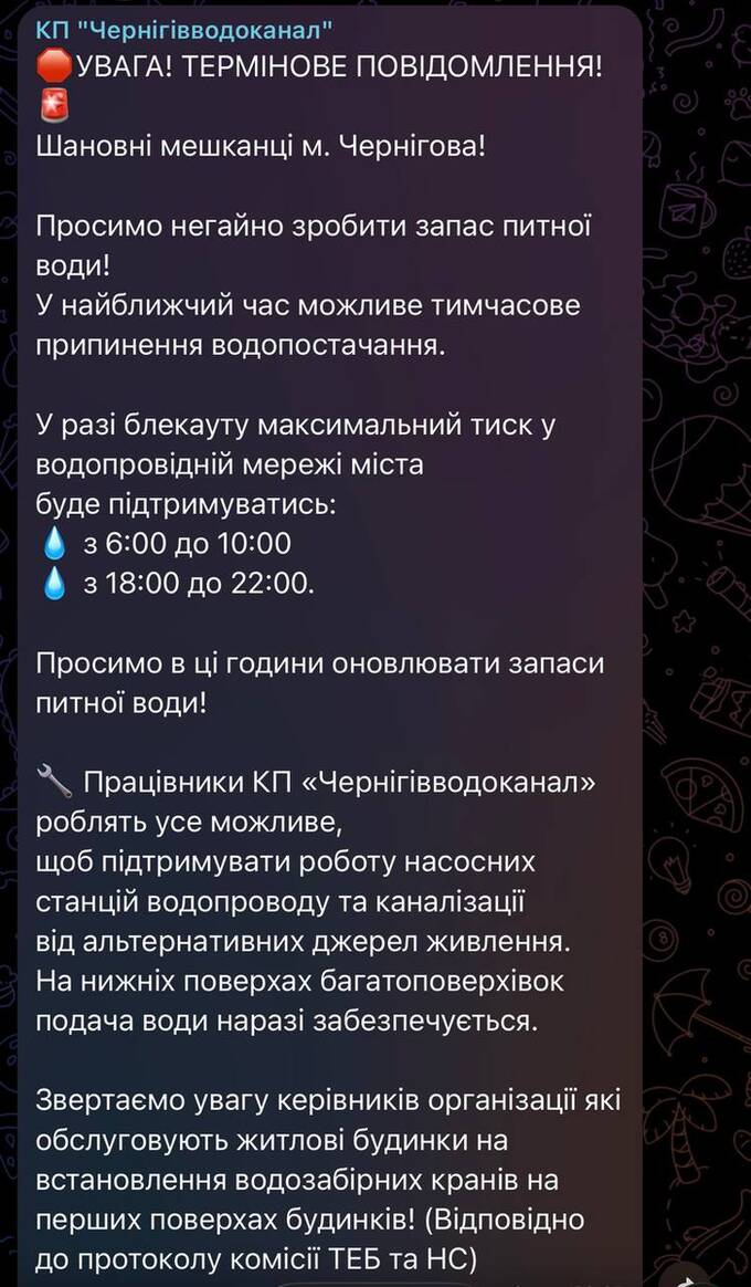 В связи с массовыми отключениями электроэнергии, вызванными ударами по энергоструктуре, коммунальное предприятие «Черниговводоканал» обратилось к жителям Черниговщины с призывом создать запасы питьевой воды.