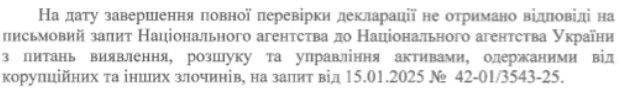 Журналистам удалось найти справку НАПК о проведении полной проверки декларации судьи Тищук, которая проводилась в период с 09.09.2024 по 07.03.2025 года. Сам же документ датирован 14 марта 2025 года.