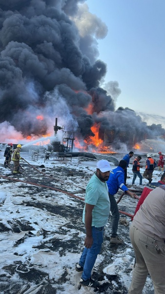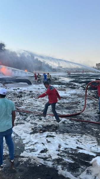 На видео, опубликованных в социальных сетях, видно, что территория охвачена пламенем и густым черным дымом. Пожарные в защитном снаряжении боролись с огнем, используя белую пену для покрытия места происшествия.