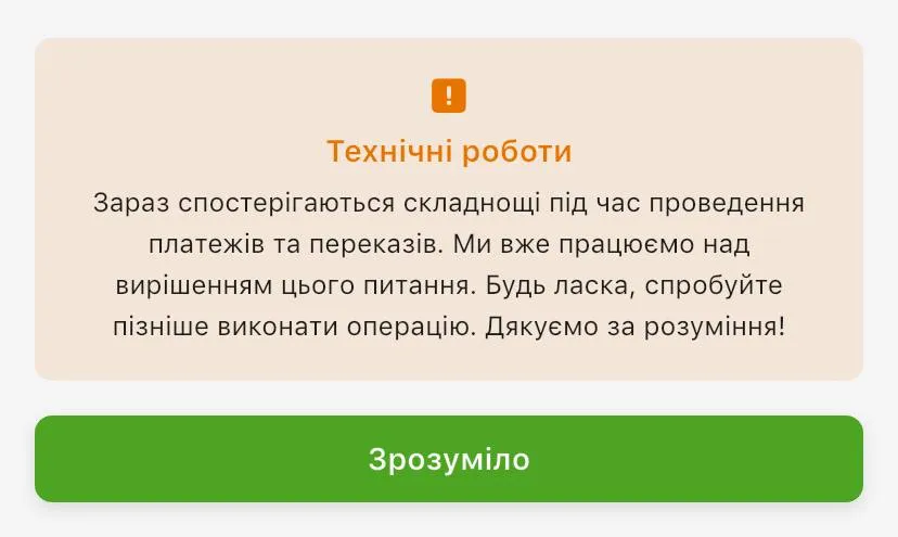 "Сейчас наблюдаются сложности при проведении платежей и переводов. Мы уже работаем над решением этого вопроса. Пожалуйста, попробуйте позже выполнить операцию. Спасибо за понимание!" – говорится в сообщении.