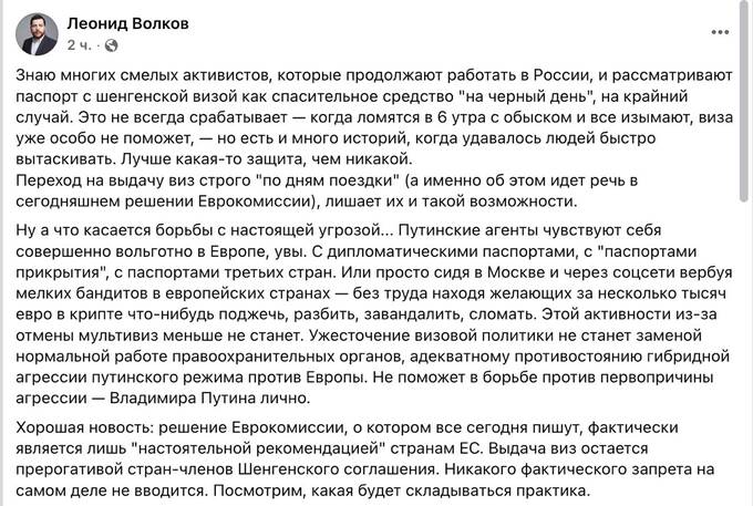 "Что касается противодействия реальной опасности... Агенты Путина чувствуют себя в Европе абсолютно свободно, к сожалению. Они используют дипломатические паспорта, "паспорта прикрытия", документы третьих стран. Или, оставаясь в Москве, через социальные сети вербуют мелких преступников в европейских странах, без труда находя тех, кто за несколько тысяч евро в криптовалюте готов поджечь, разрушить, испортить или сломать что-либо. Отмена мультивиз не уменьшит эту активность", - подчеркивает Волков.