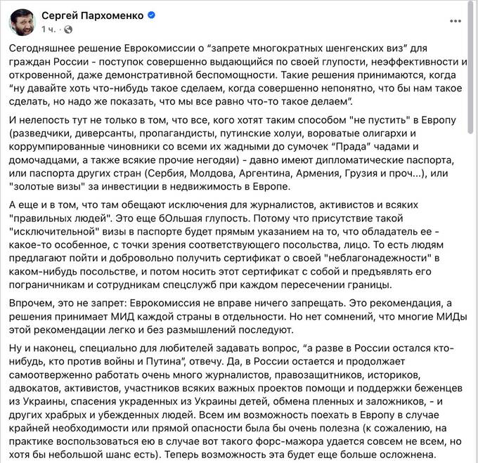 Он также считает, что предусмотренное Еврокомиссией исключение для "правильных" журналистов и активистов из России фактически превратится для них внутри страны в "сертификат неблагонадежности" с точки зрения российских властей.