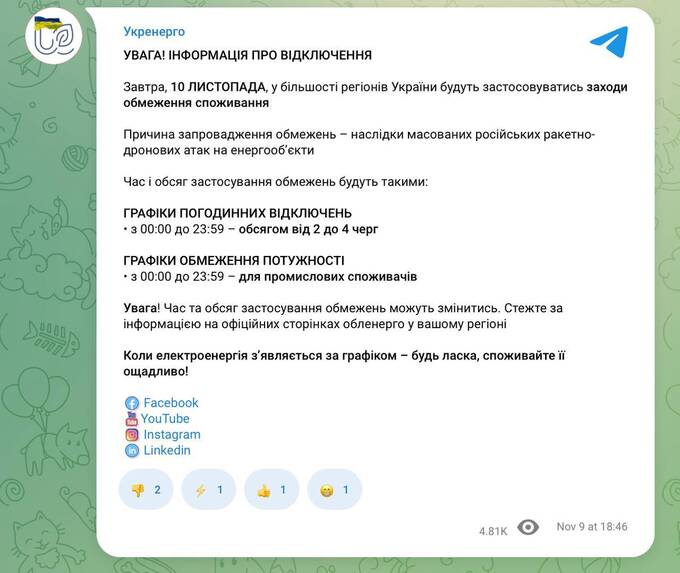 Время и объем отключений могут изменяться. «Укрэнерго» советует следить за обновлениями на официальных страницах региональных облэнерго. В компании также призывают экономно потреблять электроэнергию во время её подачи по графику.