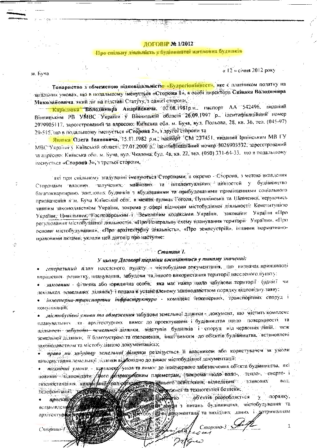 Спочатку земля для майбутнього об’єкту забудови оформлялася, навіть по півгектара в одні руки, через підставних осіб в межах земель Лісового фонду (для прикладу деякі копії Державних актів на громадян Глива, Ніколайчук, Павловський). Далі, за дивних обставин, всі власники земельних ділянок одночасно, через нотаріальні дії, передають права на розпорядження своїми земельними ділянками двоюрідному брату пана Федорука – Олегу Яцюку. Згодом пан Яцюк уповноважує ТОВ “Будрегіонінвест”, засновниками якого є дружина Федорука – Людмила Федорук та дружина його колишнього заступника і кума Володимира Карплюка – Лариса Карплюк, розпоряджатися земельними ділянками під будівництво багатоповерхових житлових кварталів. На завершення цієї корупційної схеми ТОВ “Будрегіонінвест” в особі Людмили Федорук та Лариси Карплюк, персонально Володимира Карплюка та Олега Яцюка заключають Договір № 1/2012 про спільну діяльність від 12.01.2012 року на будівництво цього об’єкту та вказують свої грошові вклади.