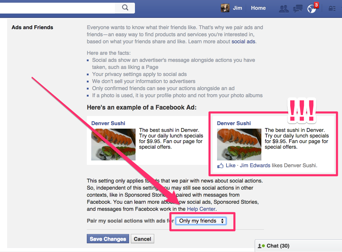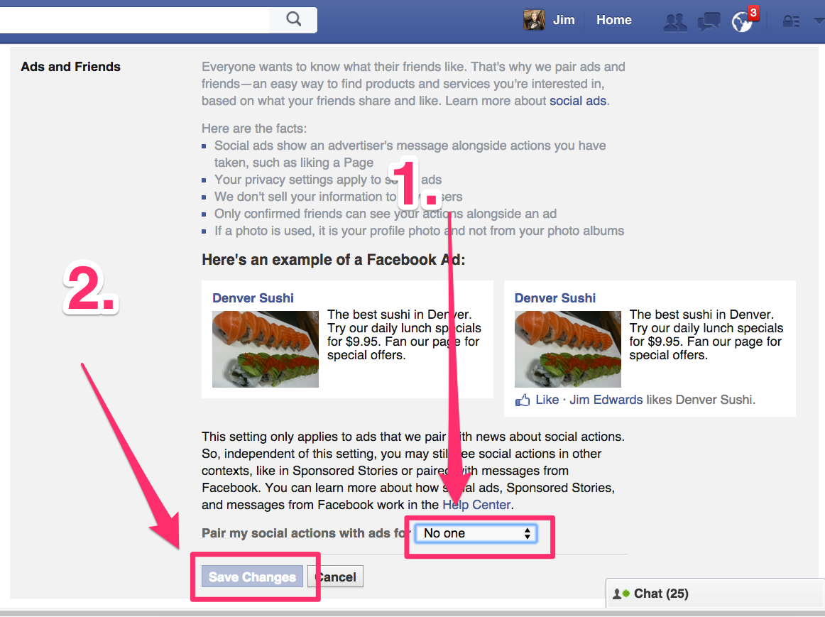 Появившееся после нажатия этой кнопки меню покажет, как ваши данные используются в рекламе. Этот гипотетический пример говорит о том, что друзья автора страницы видят рекламу суши-бара, на рассылку которого он подписался.