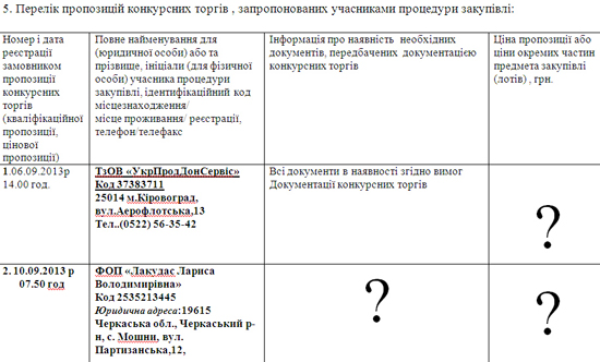 На тендер подалися два учасники. Лакудас і кіровоградське ТОВ "Укрпроддонсервіс". За законом всі пропозиції фіксуються у протоколі розкриття конкурсних торгів, який публікується на сайті "Вісника державних закупівель".
