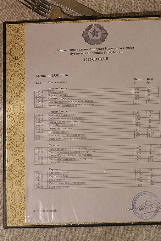 "После, предложили отобедать и пообщаться на различные "конфиденциальные" темы. Ничего такого секретного не происходило. Но вот, что я хотел вам поведать: в республике все реально идет к лучшему. Кто не верит, смотрите сами, меню из столовой Совета Министров ЛНР, сделал пару фотографий на мобильный. (простите за качество) Патриотические названия блюд, низкие цены, все у нас хорошо! На зависть укропам выкладываю фото. Смотрите и пускайте слюни нищеброды!" – похвастался Адиков, которого пустили поесть в столовую для верхушки "ЛНР".