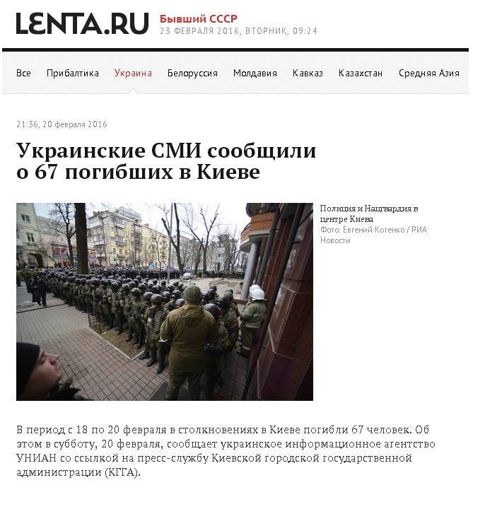Так, на сайті російського видання Lenta.ru повідомили: "У період із 18 по 20 лютого внаслідок зіткнень в Києві загинули 67 осіб".