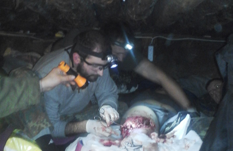 С этого момента операционной стал блиндаж — яма, перекрытая брусьями дерева-кругляка, землей, бетоном, клеенкой и шинами. Операционным столом — лежаки, накрытые кариматом, с которого легко вытирать кровь, чтобы потом самому же спать на нем же. Операционными лампами служили светодиодные фонарики. А минимальный набор инструментов из лекарственной сумки пришлось пополнить клещами нашего электрика — они превратились в ампутационные кусачки. Удавалось поддерживать относительную стерильность операционного поля и рук хирурга (еще был запас растворов для стерилизации и перчаток). Пригодился мой опыт Майдана: методы эмпирической полевой холодной стерилизации были применены и здесь.