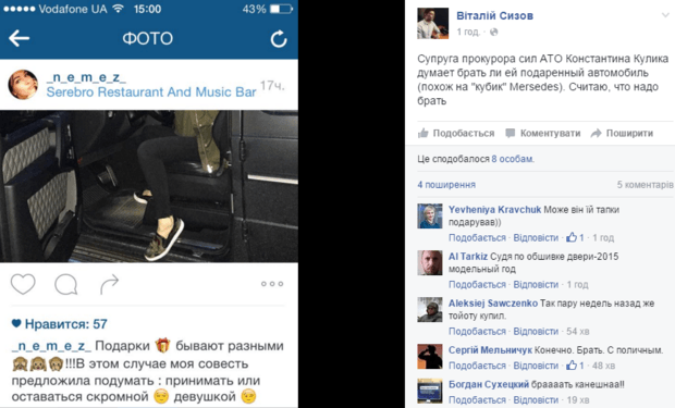 "Супруга прокурора сил АТО Константина Кулика думает, брать ли ей подаренный автомобиль (похож на "кубик" Mersedes). Считаю, что надо брать", - написал журналист Виталий Сизов в своем Facebook.