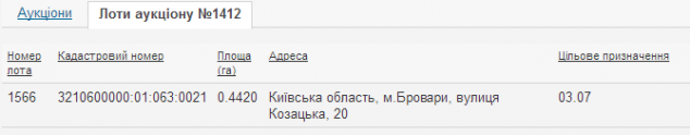 Второй лот площадью 0,4 га находится по ул. Вячеслава Чорновола, 3 (кадастровый номер земельного участка - 3210600000:00:015:0539) отдали для строительства и обслуживания торговых зданий. Его оценили в 1 324 928, 00 млн. грн. - 33 123 грн за сотку. Стартовая цена лота была установлена в размере 1 204 480,00 грн., то есть продать удалось также на 10% дороже.