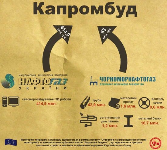 Ця історія - про подібну "прокладку" - ТОВ "Капромбуд", яке за півроку виграло 477,9 млн грн на тендерах "Нафтогазу" і сумнозвісного "Чорноморнафтогазу".