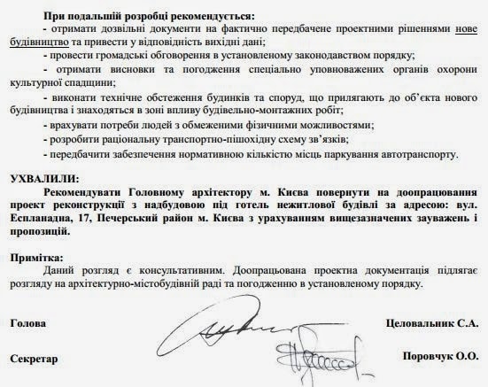 Архитектурный градсовет, как видно из нижеприведенного документа,  не сразу пошел навстречу "Семье" и Андрею Кравцу. Но в целом одобрил строительство гостиницы, обратив внимание на недочеты, которые рекомендовал устранить.  Этот документ вызывает некий когнитивный диссонанс. С одной стороны, градсовет решил: "Рекомендовать главному архитектору вернуть на доработку проект реконструкции с надстройкой под гостиницу". А с другой, - рекомендовал "Информзахысту" "получить разрешительные документы на фактически предусмотренное проектными решениями новое строительство". Вообще же рекомендации городских архитекторов были очень правильными.  Но, тем не менее, эта инстанция была пройдена, а некоторые рекомендации так и остались рекомендациями "консультативного характера".