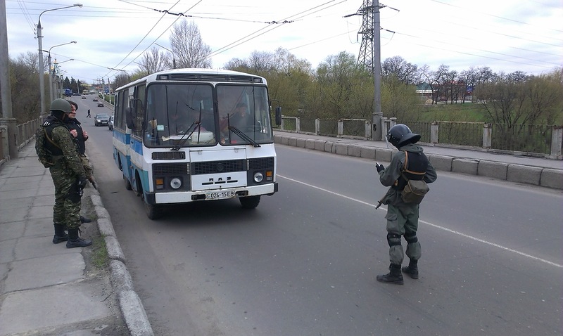 Поначалу, когда в Славянске захватили отделение милиции, я подумал, что это очередной налет маргиналов. Точно также у нас в Донецке толпы людей поначалу захватывали милицию, прокуратуру и СБУ, а потом просто громили кабинеты и уходили. Но когда мы въехали в город, стало понятно, что там все куда серьезнее. Впервые я увидел на блокпостах вооруженных людей, похожих на крымских "зеленых человечков". Прямо у меня на глазах в город попытался заехать "пазик" с милицией, но его просто остановили на мосту двое вооруженных боевиков, после чего автобус развернулся и уехал без долгих разговоров (фотография этого момента есть в моем репортаже ниже). В этот момент стало понятно, что местная власть не контролирует ситуацию или же подыгрывает захватчикам. Двоих людей на мосту менты могли обезвредить без особых усилий, но даже не попытались этого сделать.